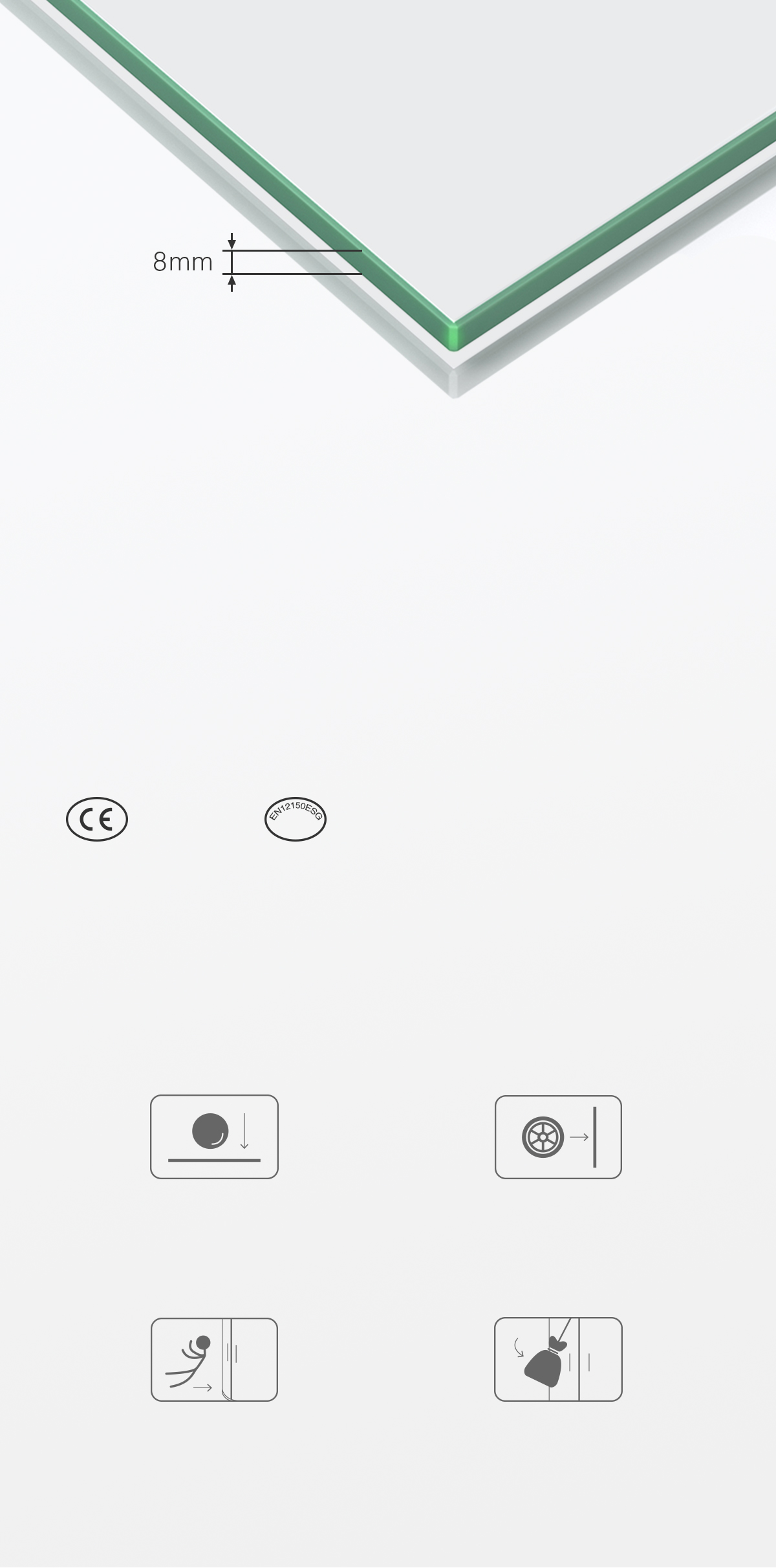 - Nach DIN EN12150 geprüftes Einscheibensicherheitsglas(ESG), 8mm Glasstärke.